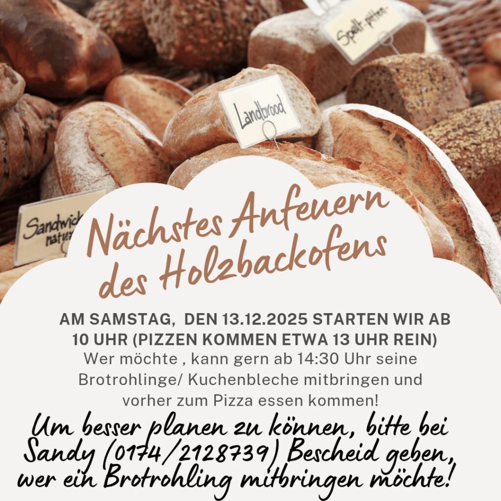 am Samstag, den 13.12.2025 starten wir ab 10 Uhr und feuern den Ofen an. Die ersten Pizzen kommen etwa um 13 Uhr in den Ofen.