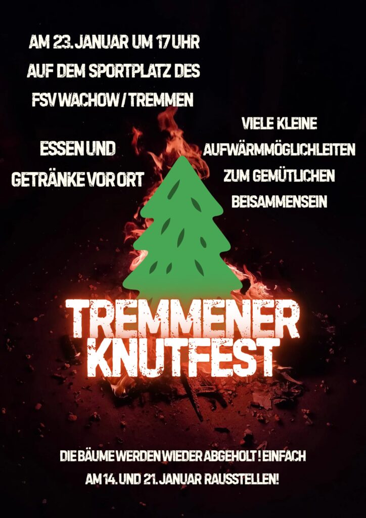 am Freitag, den 23. Januar 2026 um 17 Uhr wollen wir wieder auf dem Sportplatz gemeinsam unsere Weihnachtsbäume beim Knutfest verbrennen.